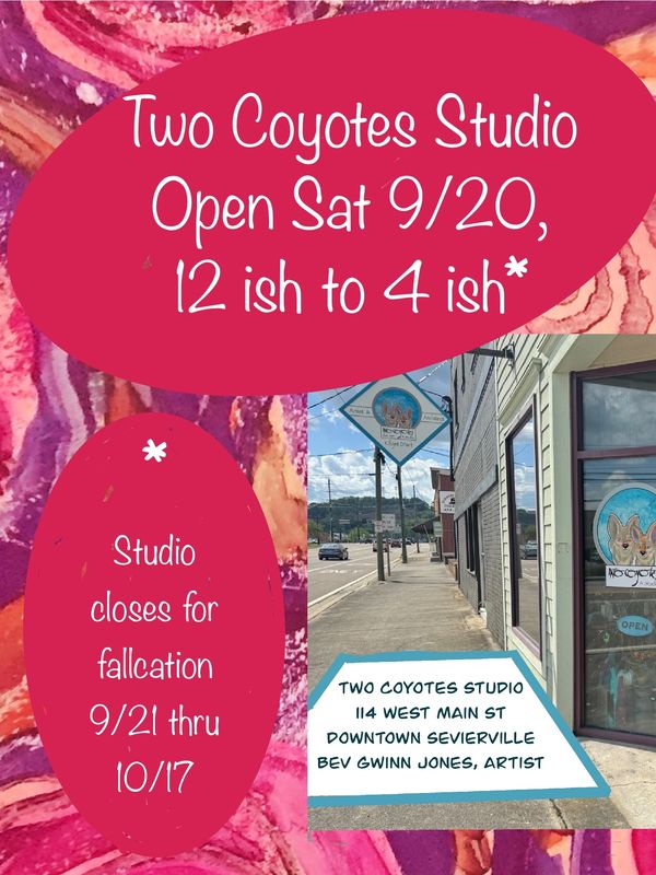 Bev is a multi-faceted artist and art instructor living in Sevierville, TN. Two Coyotes Studio is celebrating 33 years in business. She recently relocated the studio to be on a lower street level & have an a few designated parking spaces. We are now located just 5 minutes walking distance from our old location on Court to 114 West Main St. Two Coyotes Studio opened in 1991 in Historic Downtown Sevierville.